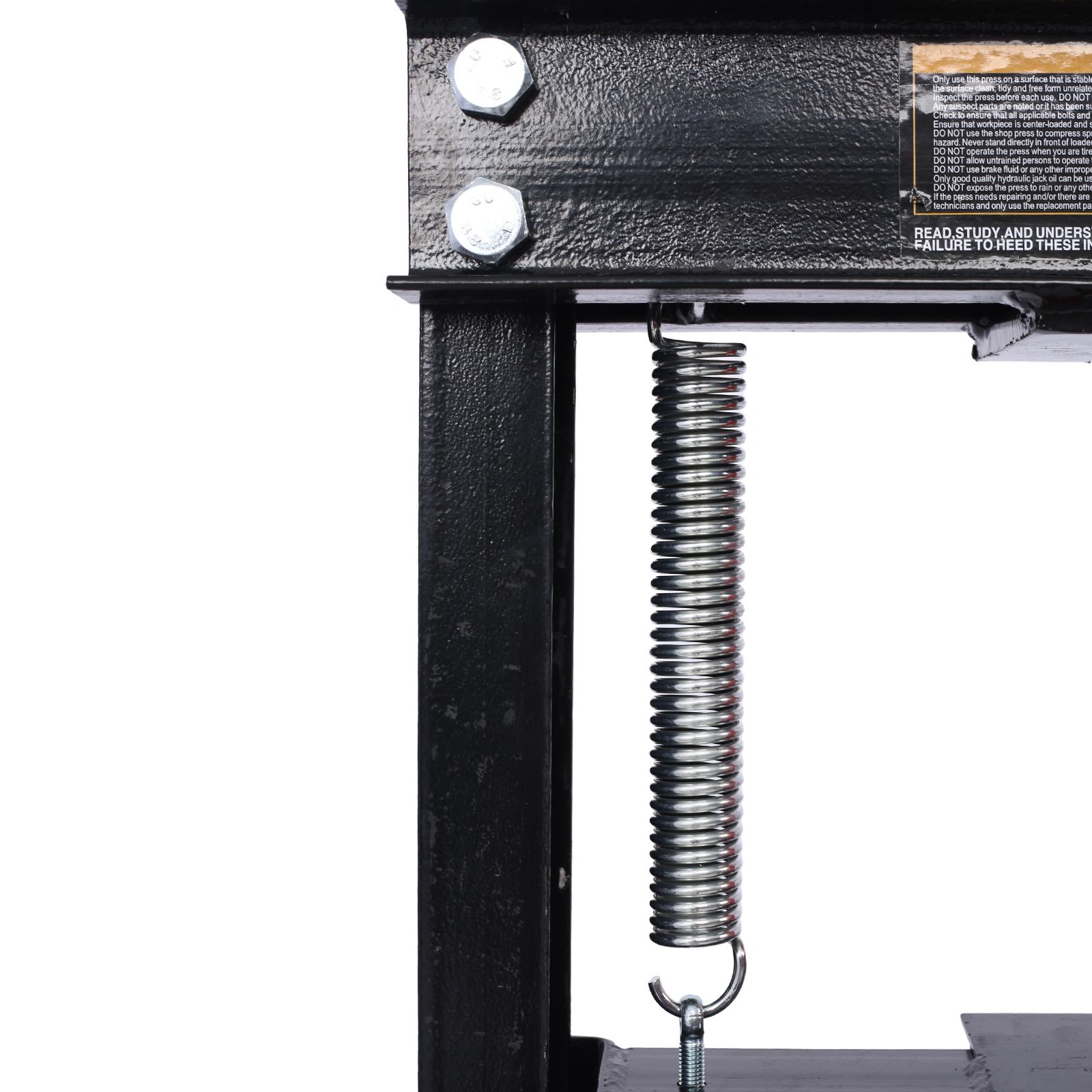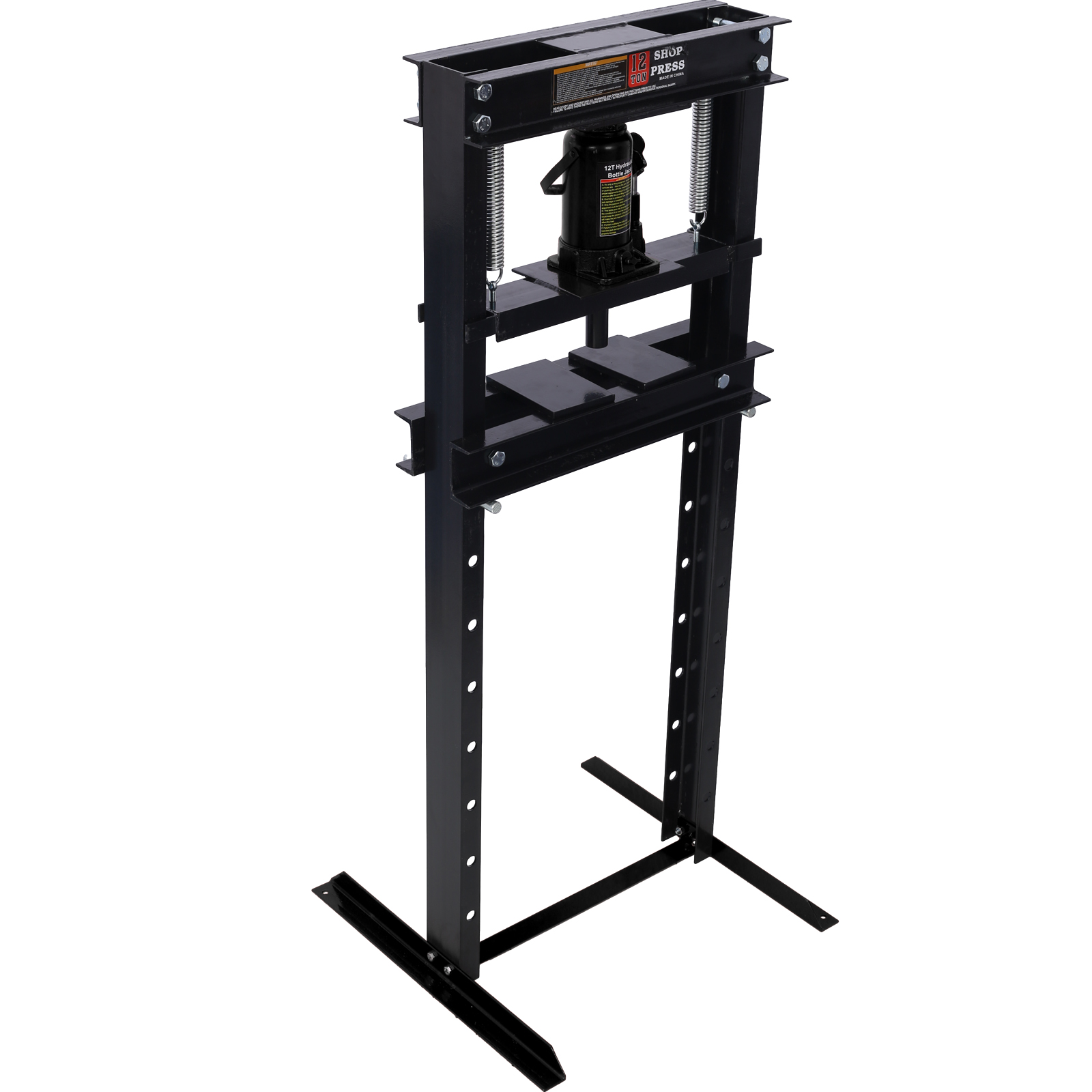 Versatile working table: Our hydraulic shop press features an adjustable working table with 8 holes on each side, allowing you to easily customize the height according to your specific needs and projects. Powerful 12-ton capacity: Equipped with a heavy-duty bottle jack with a 12-ton capacity, our hydraulic press is designed to effortlessly handle tasks like straightening and bending metal. It also comes with press plates for added convenience. User-friendly operation: Operating our hydraulic shop press is a breeze. Simply press or lift the long handle of the bottle jack to easily apply the necessary force. Please ensure all parts are fully secured before use. The pressure of the hydraulic jack can also be easily adjusted by turning the knob. Durable construction: Crafted from high-quality steel with a power coating, our hydraulic shop press boasts excellent durability and longevity. The inclusion of thickened springs ensures a robust pulling force and fast oil return. Wide range of applications: Our hydraulic shop press is perfect for various metalworking tasks, including bending, straightening, and stamping. It is an indispensable tool for auto repair shops, garages, and other small repair businesses.
